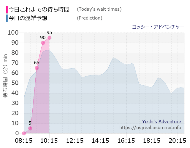 右端緑色の列は3時間ごとの平均待ち時間です。7時から10時、10時から13時、13時から16時、16時から19時、19時から22時の待ち時間を過去7日分集計します。 また、最終行は日ごとの平均待ち時間です。