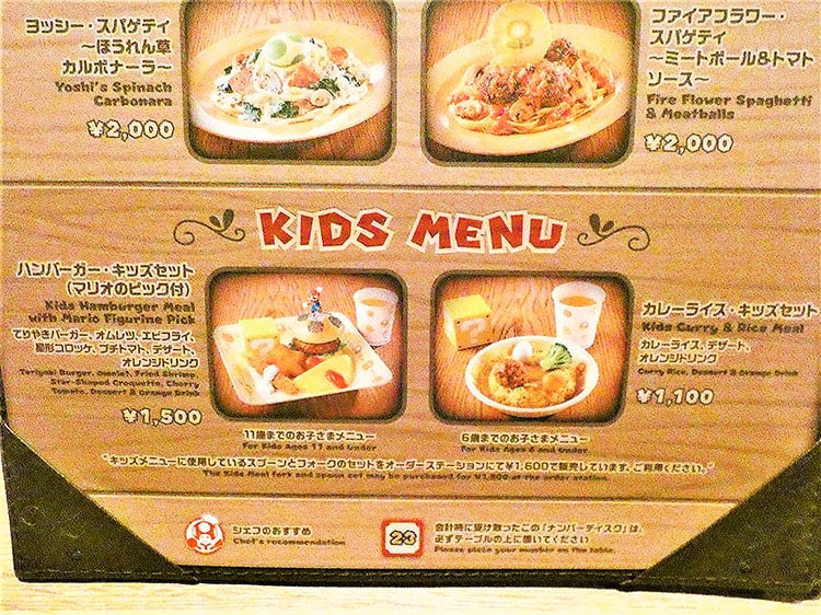・大魔王クッパ・ハンバーグステーキ(パンまたはライス付) - ¥2,200 ・フィッシュボーン・白身魚のムニエル(パンまたはライス付) - ¥2,200 ・マリオ・バーガー ~ベーコン&チーズ~¥2,100 ・ルイージ・バーガー ~グリーンカレー・チキン~¥2,100 ・照り焼きチキン&スーパースター・ライス¥2,000 ・シェフ特製 オムライス&エビとキノコのクリーム煮込み - ¥2,000 ・ヨッシー・スパゲティ ~ほうれん草カルボナーラ~¥2,000 ・ファイアフラワー・スパゲティ ~ミートボール&トマトソース~ - ¥2,000