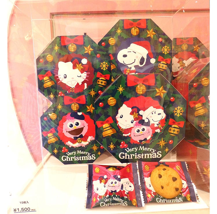 クリスマスコーデに身を包んだパークの仲間たちが顔を覗かせるパッケージの中には、おいしいチョコチップクッキーとナッツクッキーが入っています。