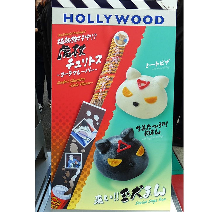 伏黒が十種影法術(とくさのかげぼうじゅつ)で召喚する「玉犬(白/黒)」がパークの人気メニュー、キャラまんに変身しました。