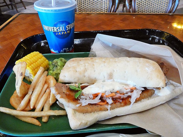 照り焼き&タルタル・ポークサンド、焼きとうもろこし、枝豆とアボカドのサラダ、ポテトチップス、フライドポテト、ソフトドリンク(R)