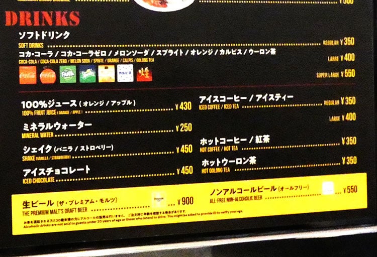 ・100%ジュース(オレンジ/アップル) 価格430円 ・ミネラルウォーター 価格250円 ・シェイク(バニラ、ストロベリー) 価格450円 ・アイスチョコレート 価格450円 ・アイスコーヒー/アイスティー 価格350円 ・ホットコーヒー/紅茶 価格350円 ・ホットウーロン茶 価格350円