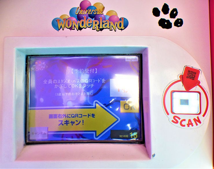 ① 対象のアトラクションそばにある発券機に利用人数分全員分のスタジオパスを持って向かう。