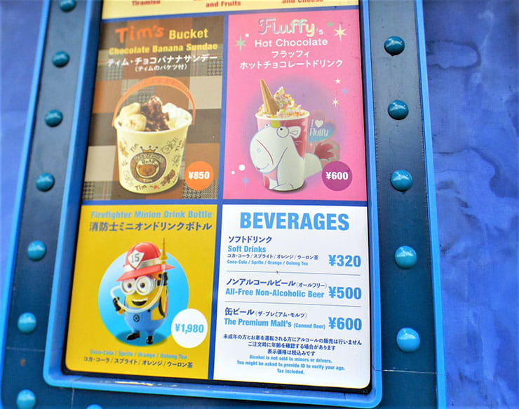 ・ティム・チョコバナナサンデー(ティムのバケツ付) 850円 ・フィラッフィホットチョコレートドリンク 600円 ・消防士ミニオンドリンクボトル 1900円 ・ソフトドリンク(コカ・コーラ・スプライト・オレンジ・ウーロン茶) 320円 ・ノンアルコールビール(オールフリー) 500円 ・缶ビール(ザ・プレミアム・モルツ) 600円