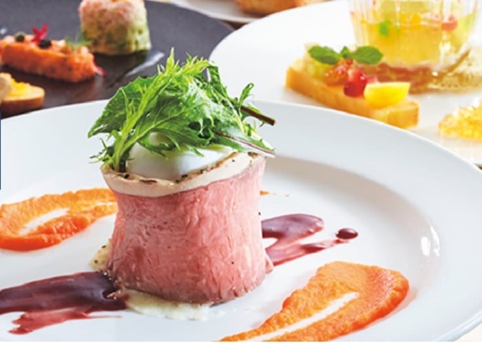 ・オードブルバリエ フォアグラのテリーヌとドライフルーツのカナッペ、トラウトサーモンタルタルのキャビア添え、アボカドとカニのガトー仕立て ・ローストビーフ ~ポーチドエッグ風とトリュフ香るポテト~ or ・舌平目の香草パン粉焼き ~魚介とビーツのスープ仕立て~ ・パン ・マンゴームースとチーズケーキのジュエリー仕立て