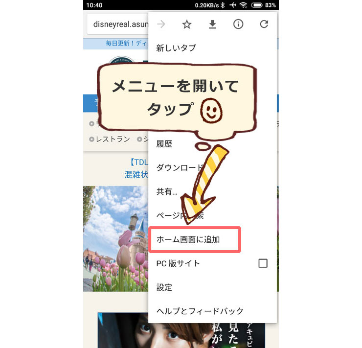 2.アクションアイコンの並びにあるホーム画面に追加をタップ